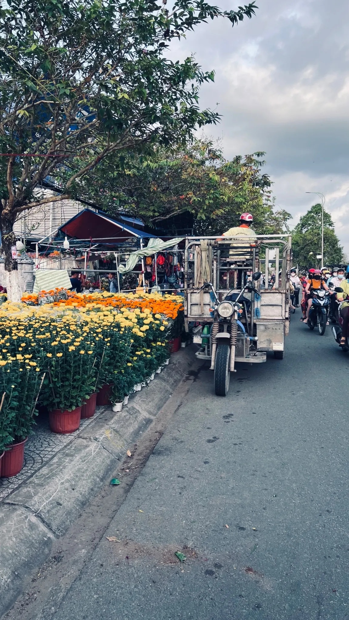 En fin de journée, Ben Tre change clairement d’ambiance. La ville commence à s’animer quand la chaleur retombe, et la vie locale se concentre le long du Mékong. Ici, pas de night market structuré comme dans les grandes villes du Vietnam, mais plutôt une succession de stands temporaires, de petits vendeurs de rue et de nombreux fleuristes, très présents dans la région. C’est surtout en te baladant le long du fleuve que tu tomberas sur cette atmosphère vivante et locale, entre street food, discussions animées et scènes de vie du quotidien. Une immersion simple, sans mise en scène touristique.