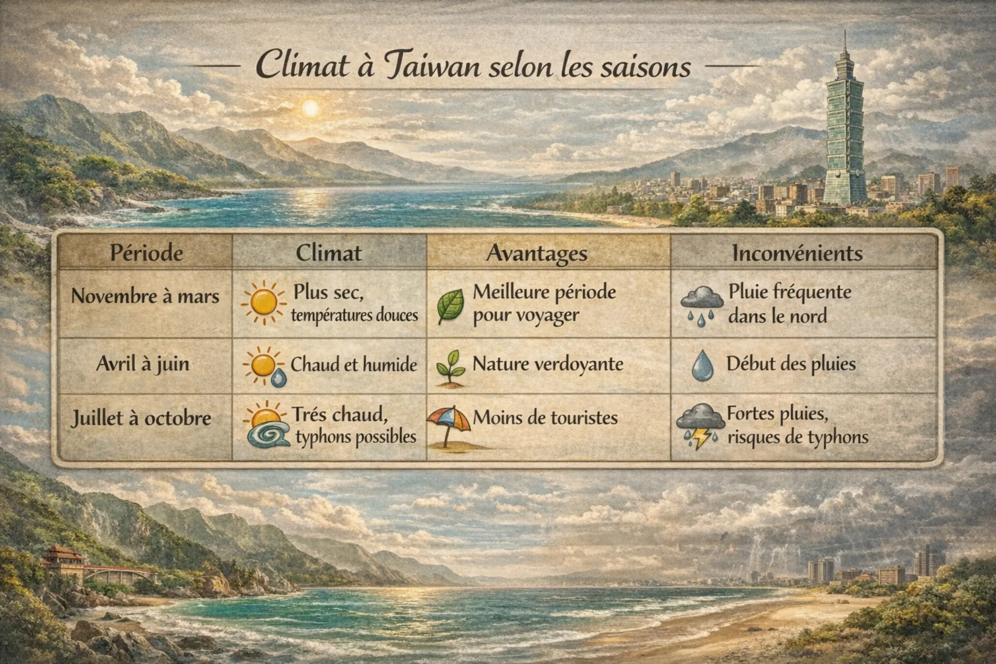 🏙️ Voyage urbain : faisable toute l’année, mais plus confortable en hiver pour observer la magnfiique Tour 101 à Taipei.