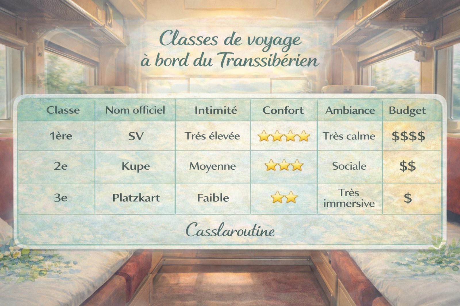 🔎 En pratique, on parle surtout de 1ère, 2e et 3e classe. Tu verras parfois les termes russes (SV, Kupe, Platzkart), mais retiens surtout la logique suivante.