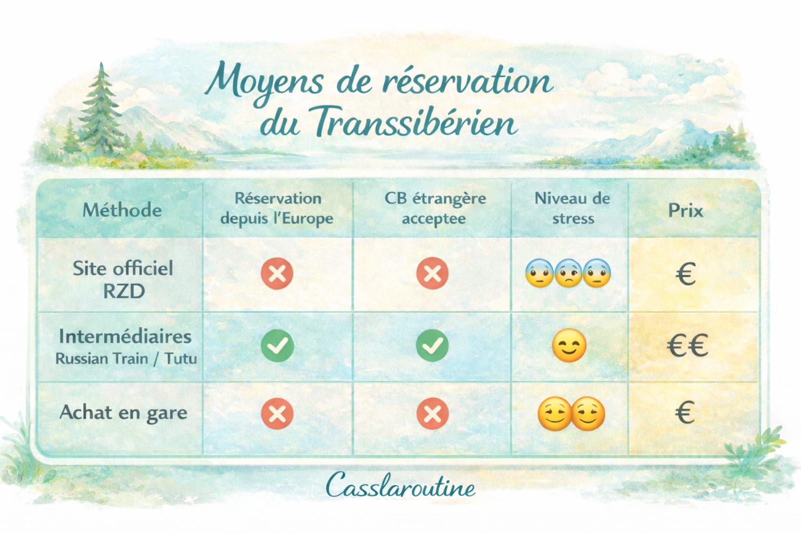 Ces deux sites te permettent de réserver tes billets en amont de ton voyage, sans avoir besoin d’une carte bancaire russe. Oui, ces plateformes appliquent une commission, ce qui rend les billets légèrement plus chers, mais elles restent à ce jour la solution la plus simple et la plus fiable pour réserver depuis l’Europe.
